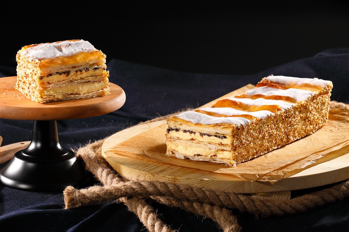 Leggerissimi strati di pasta sfoglia, farcita con crema pasticcera e ricoperta da gocce di cioccolato.