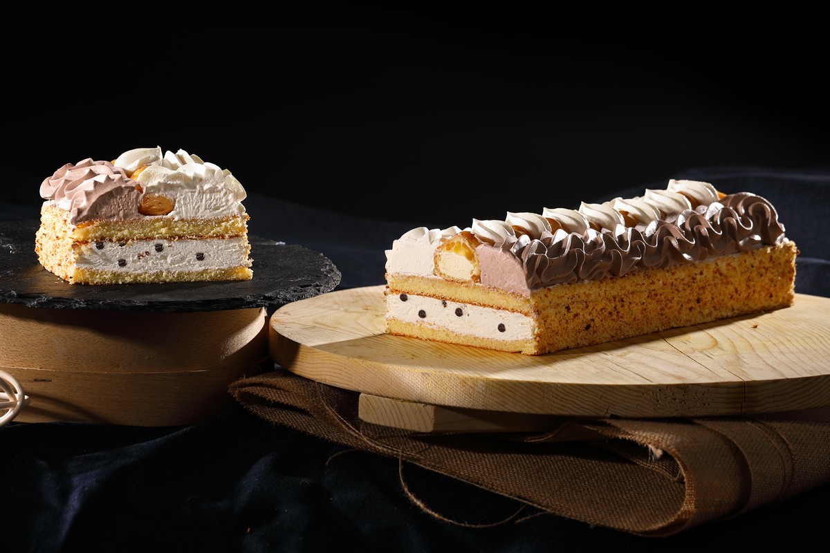Due strati di pan di spagna imbevuti di liquore fior d’arancio e colmati da una ricca farcitura di panna. Nel mezzo goccette di cioccolato e decorato con bignè caramellati e panna al cacao.